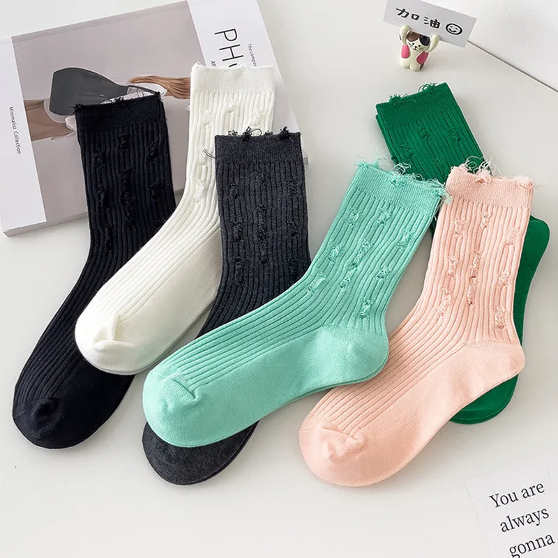 Socks for Women Fall Winter Knitted Short Socks Kawaii Harajuku y2k Vintage Ripped Breathable Solid Color Female Lingerie